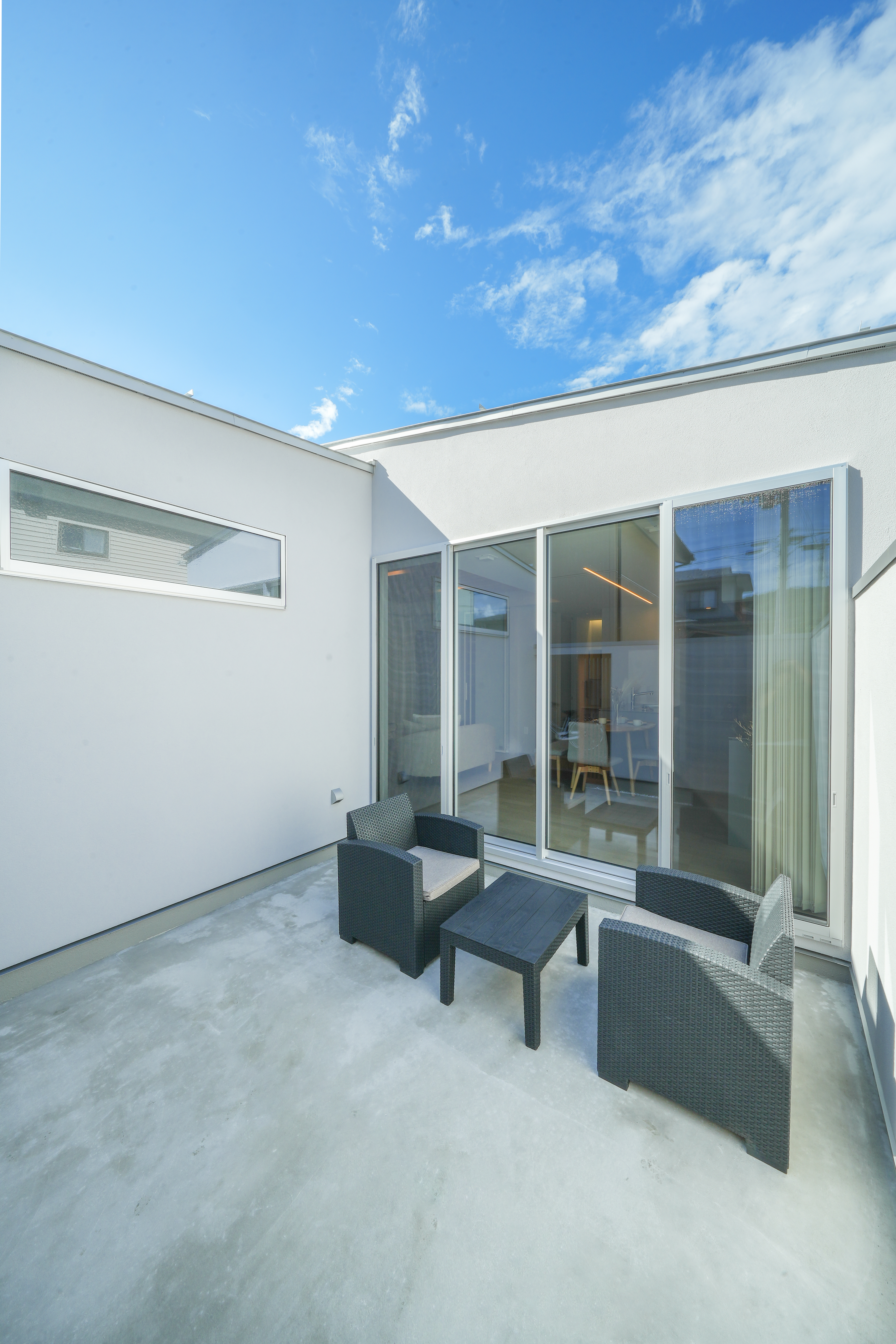 分譲地の一番奥という特性を活かし、建築家が導き出したのは、外からの視線を美しく遮りながら、内側には開放的なテラスが広がるプライベートな空間。